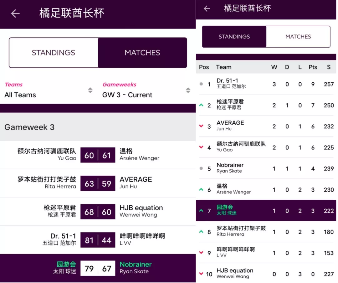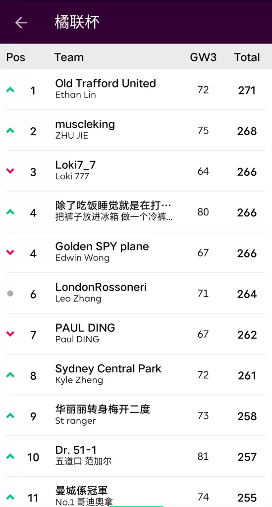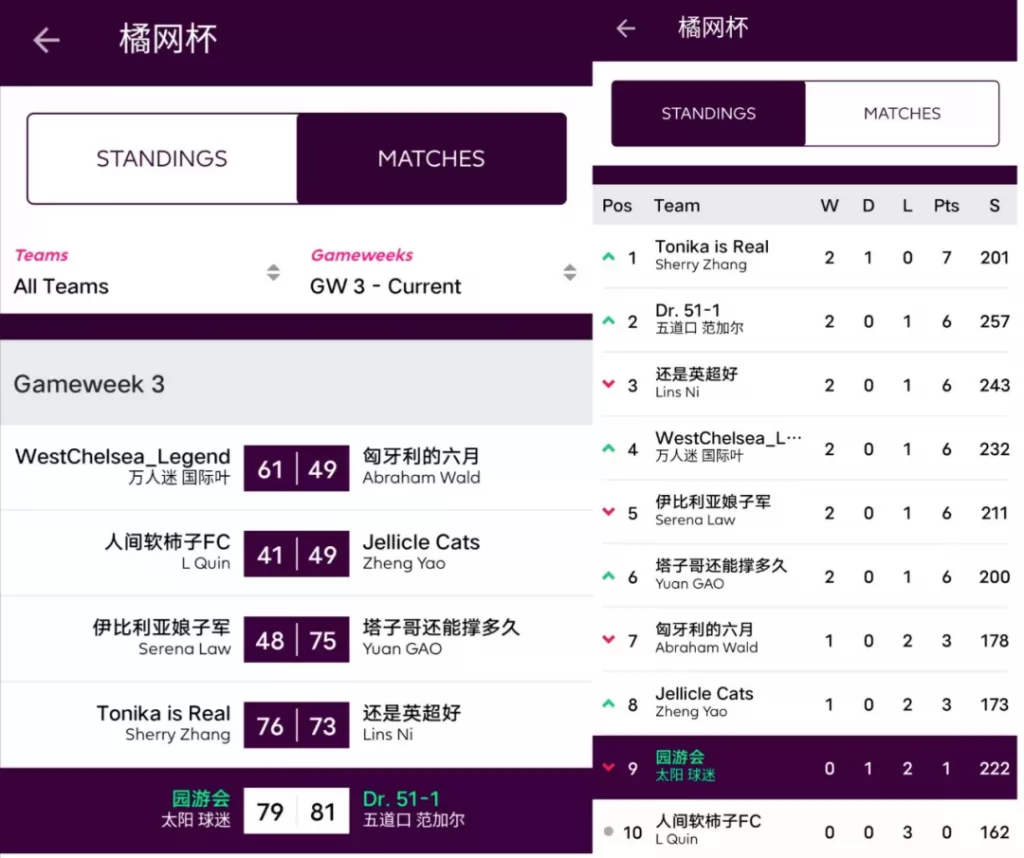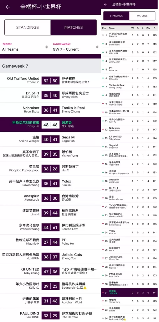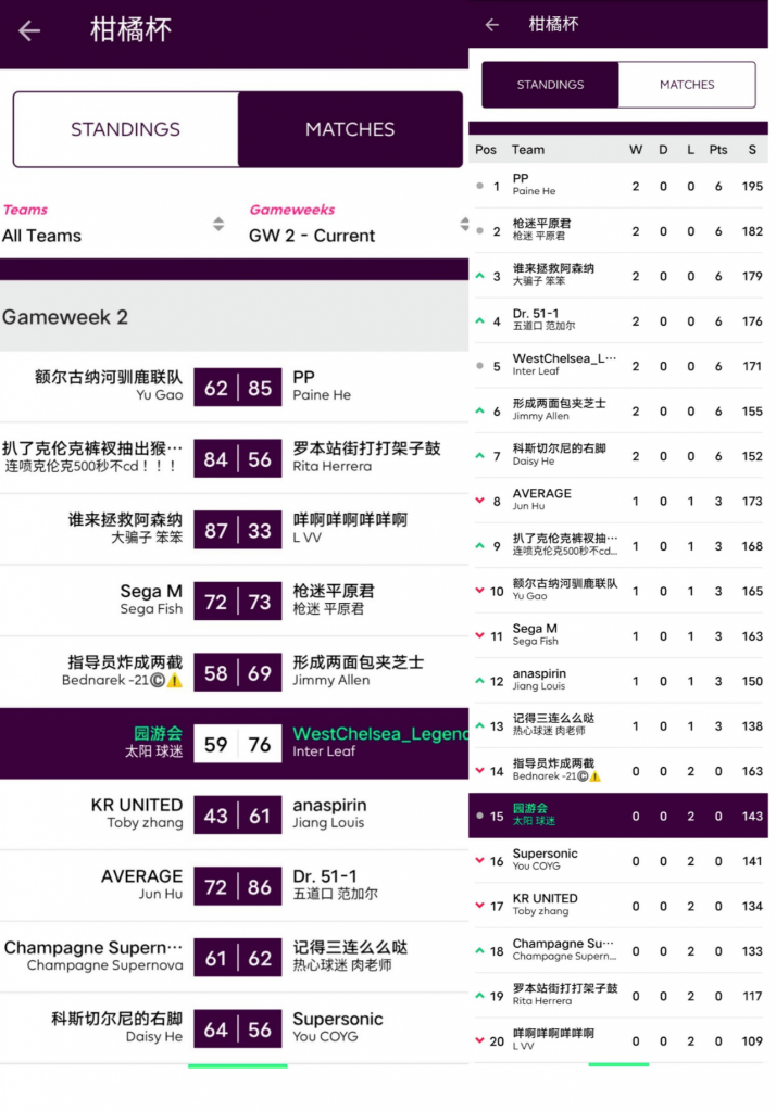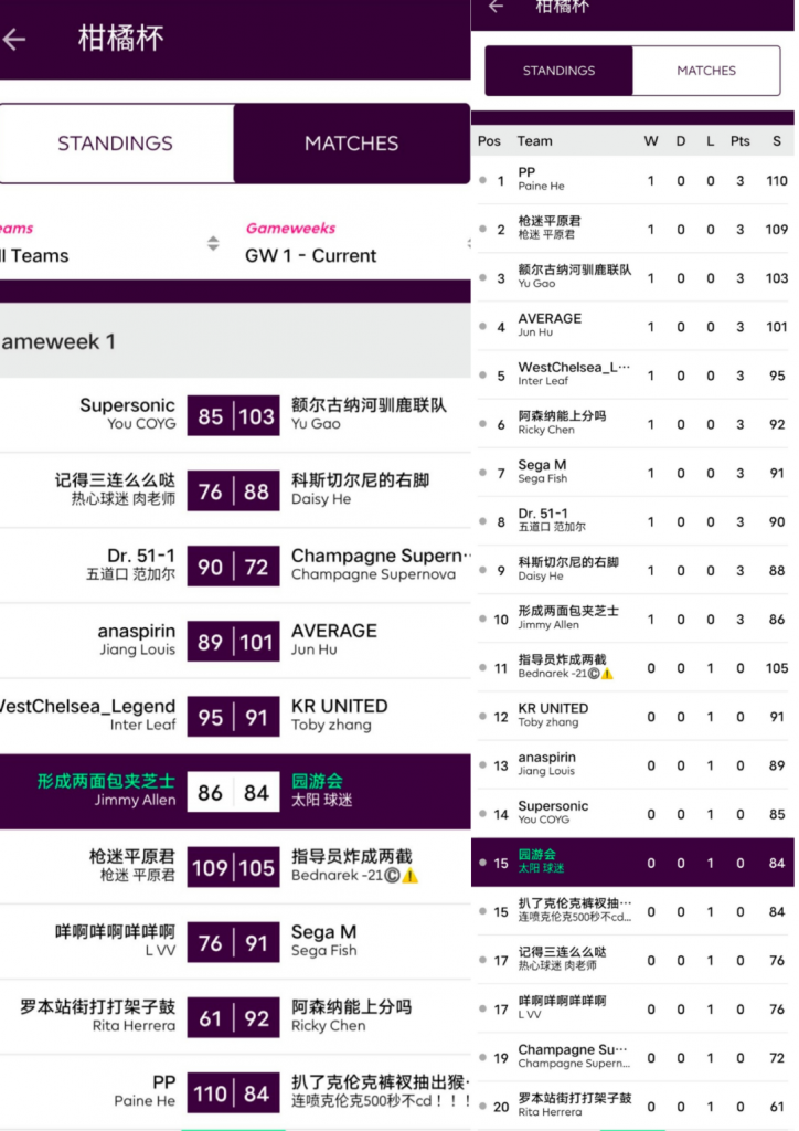 人间软柿子FC 74:97 园游会上轮被贬为“全橘杯最大鱼腩”的橘长园游会在本轮一雪前耻,用本联赛第一高分宣告了王者归来,面对副班长毫不留情取得了一场完胜;而对手Q姐本轮的表现其实并不差,坐拥了两位24分单轮最高分选手Salah+Mount,但错选队长还是遗憾败北。
