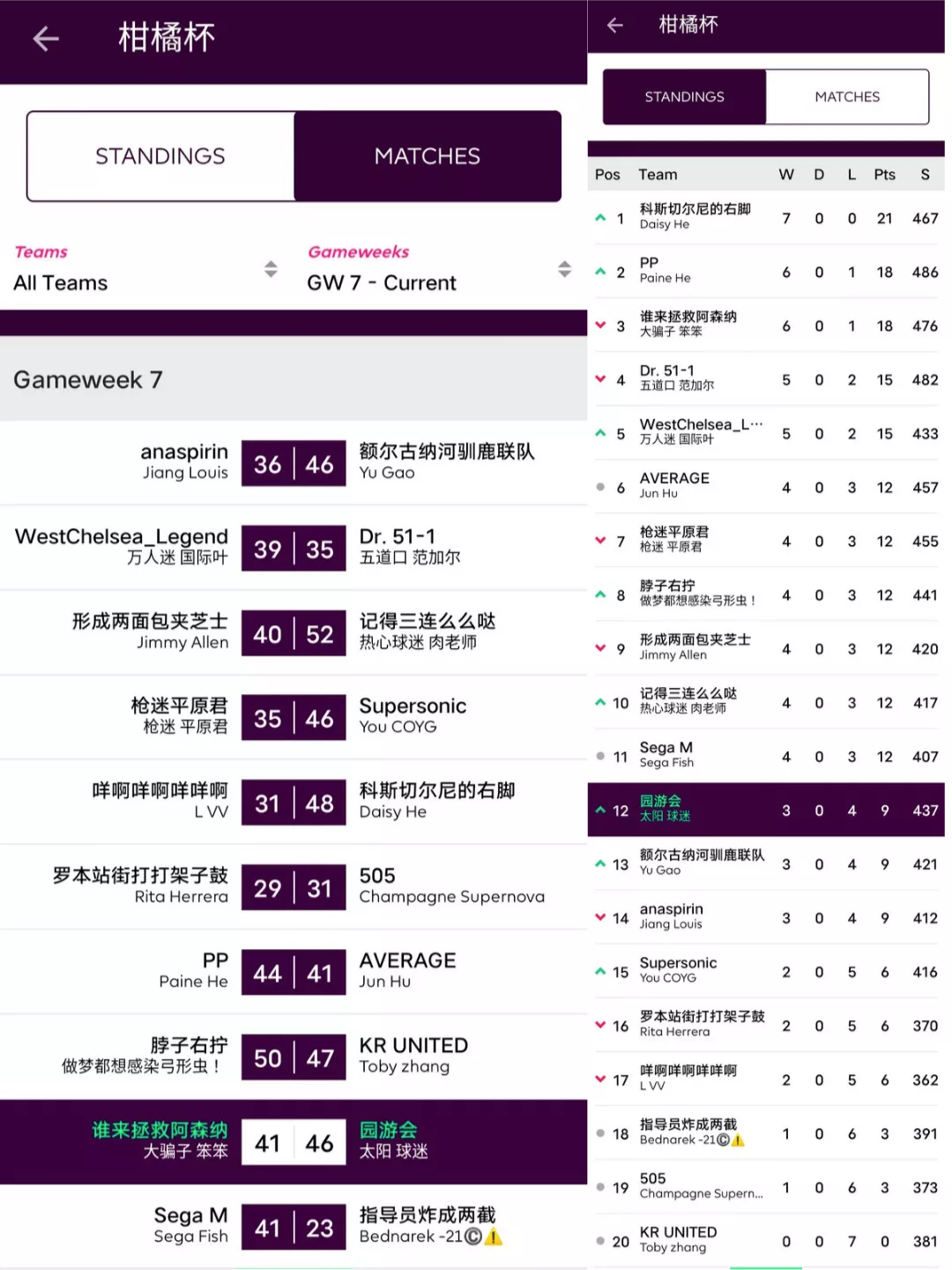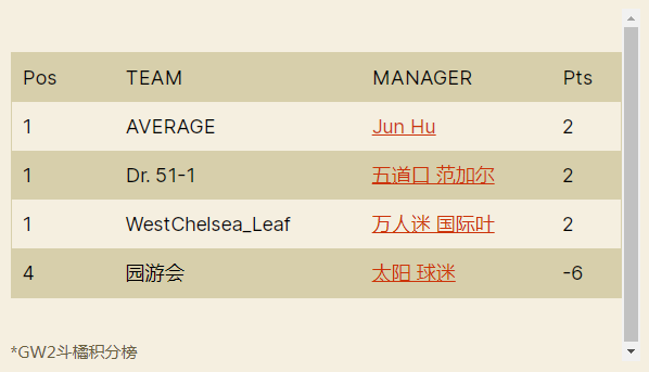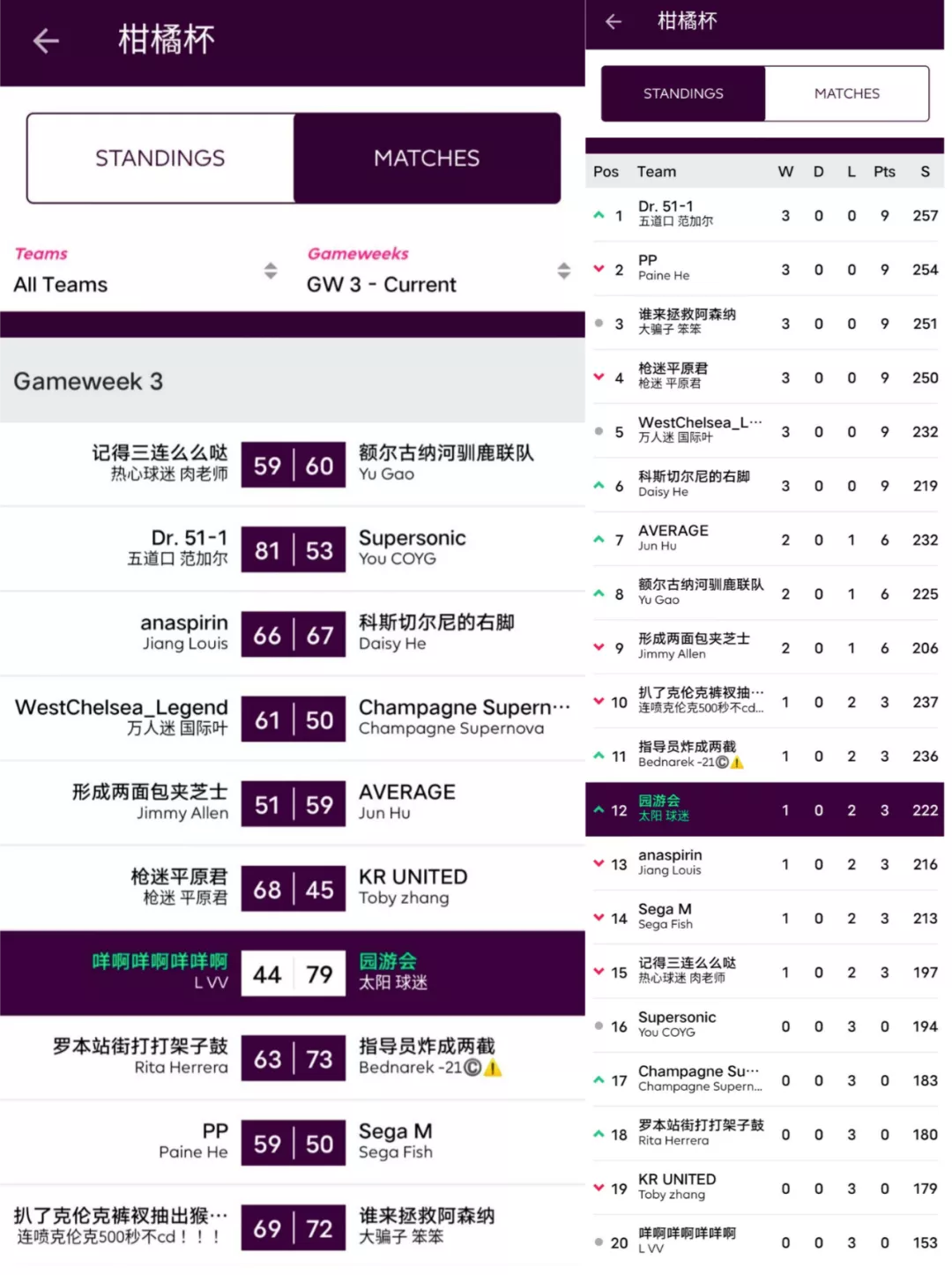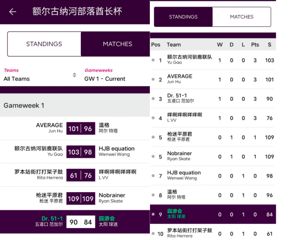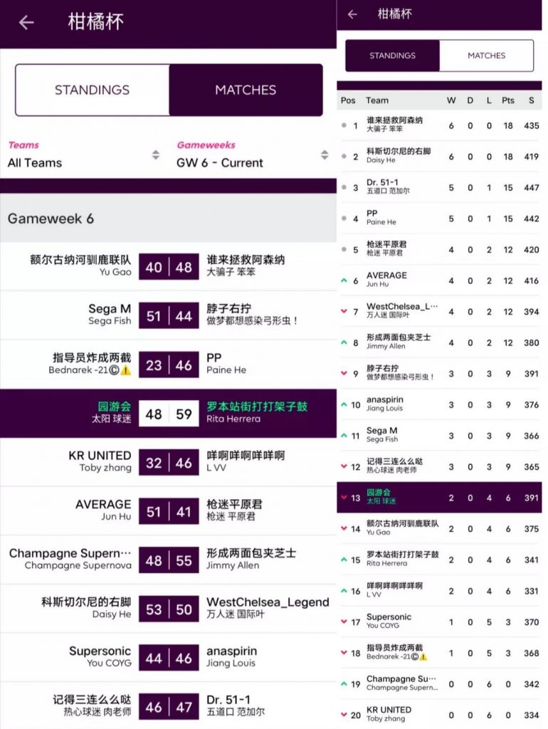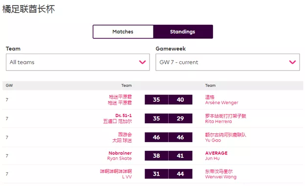 人间软柿子FC 74:97 园游会上轮被贬为“全橘杯最大鱼腩”的橘长园游会在本轮一雪前耻,用本联赛第一高分宣告了王者归来,面对副班长毫不留情取得了一场完胜;而对手Q姐本轮的表现其实并不差,坐拥了两位24分单轮最高分选手Salah+Mount,但错选队长还是遗憾败北。