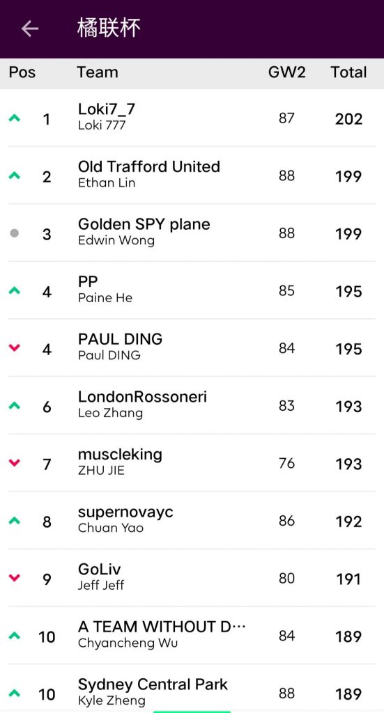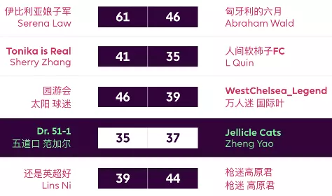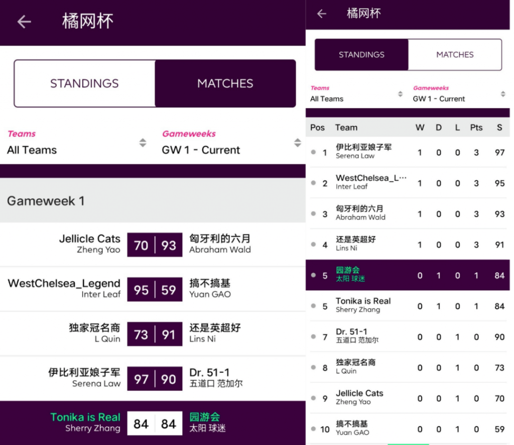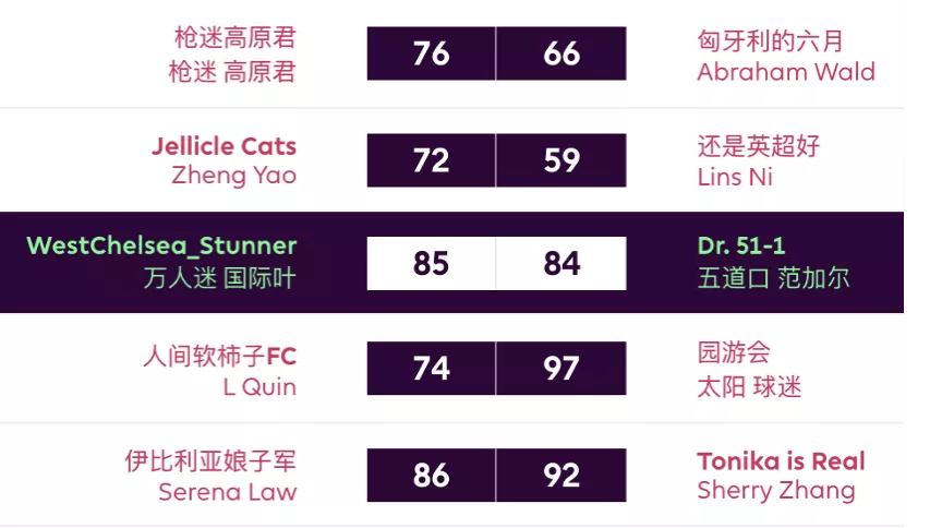 Jellicle Cats 72:59 还是英超好新秀橘猫姐在橘网杯中渐入佳境,逐渐掌握了FPL的取胜密码:哪怕只有两人上分,只要你C对了队长,一场胜利就离你不远了;对手三儿手握TAA、Salah、ESR三位分数上双选手难救主,怪就怪雪藏了丁丁队长的瓜瓜吧。橘猫姐也凭借此役的获胜与对手交换了名次。