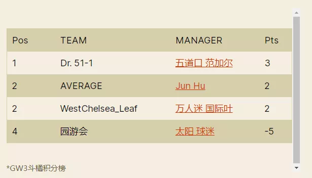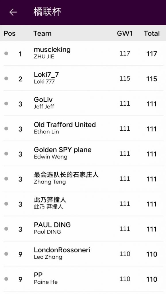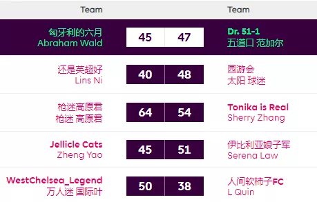 两支劲旅本场比赛的表现令人大失所望。继改名之后,Kimi本轮又扣分换4人操作对阵容进行洗牌,但可惜4人总共亏了7分,加之选错队长,没能完成真正的改头换面。而此前发挥低迷的还是英超好,本轮错信KDB为队长,扣分换人也不成功,最终本轮第三低分的主队还是英超好依靠对手的衬托,幸运拿到了赛事首胜。