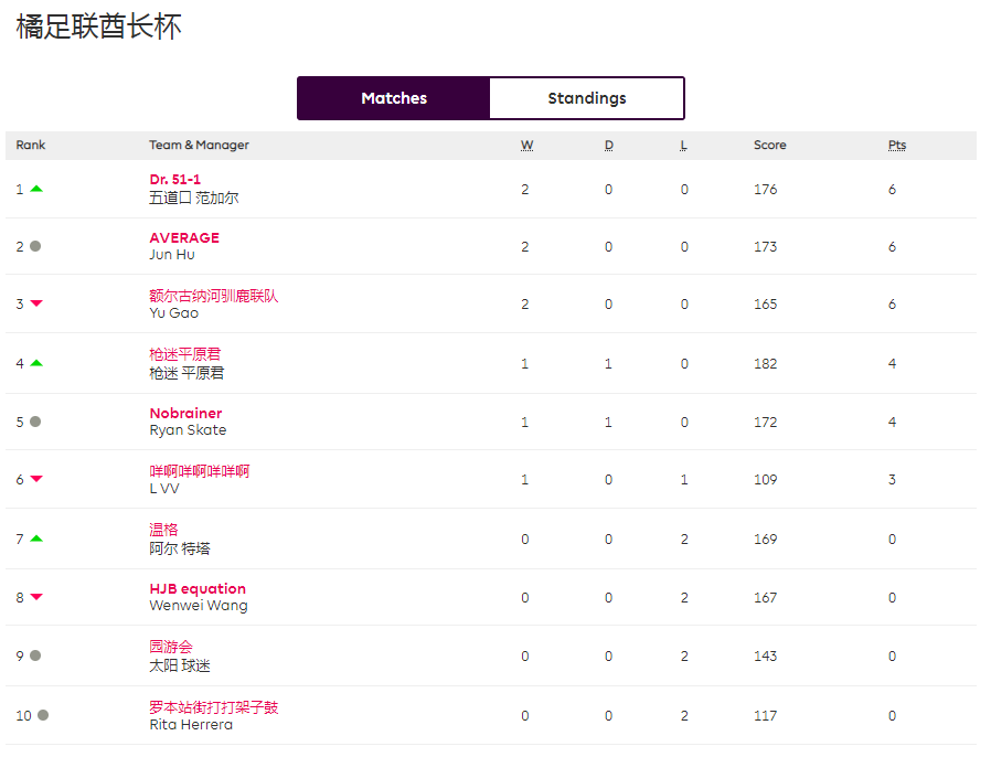 综述:积分榜前两名的Dr. 51-1和Jun本轮相继翻车,给了其他对手迎头赶上的机会,一鸣惊人的温格和成功雪恨的平原君已将差距缩小至2分;取得大捷的驯鹿联队和橘长园游会喜提绿箭头之后,占据第五、第六两个C位,东马则以1分之差退至第七;后三名的名次没有发生变化。九九归一,在酋长杯第二循环即将打响之际,各位经理又会如何调整,橘势又会发生什么变化呢?下轮状态炙手可热的温格和驯鹿联队将分别对阵惨遭滑铁卢的Jun和东马,不知是将“剩勇追穷寇”还是“沽名学霸王”?而橘长园游会在橘足联德比中,是将继续成为Dr. 51-1的ATM提款机还是将摇身一变成为POS机鲸吞对手?万圣节之际,Rita是否结束托管?一切精彩,无限悬念,尽在橘足联酋长杯。