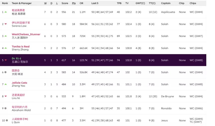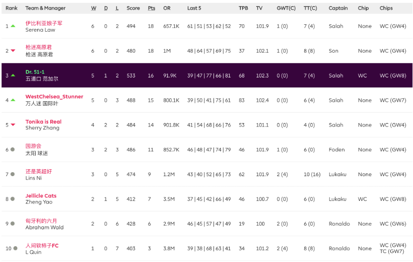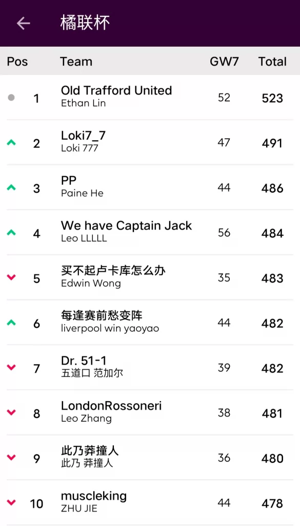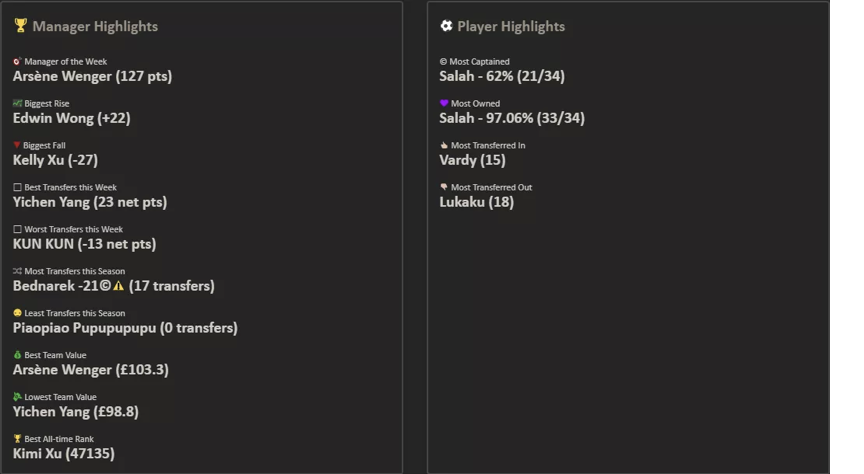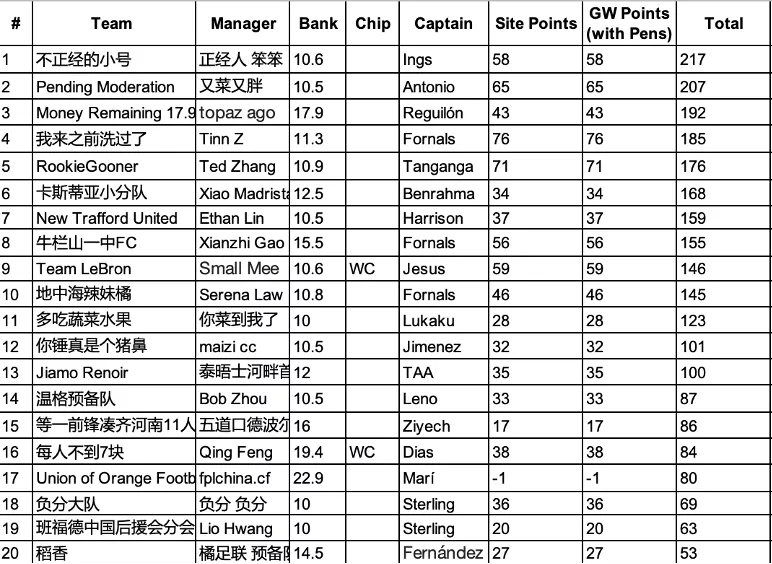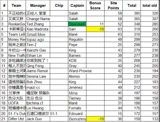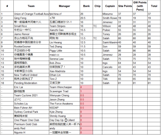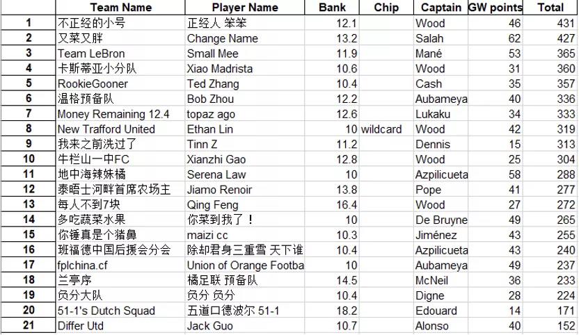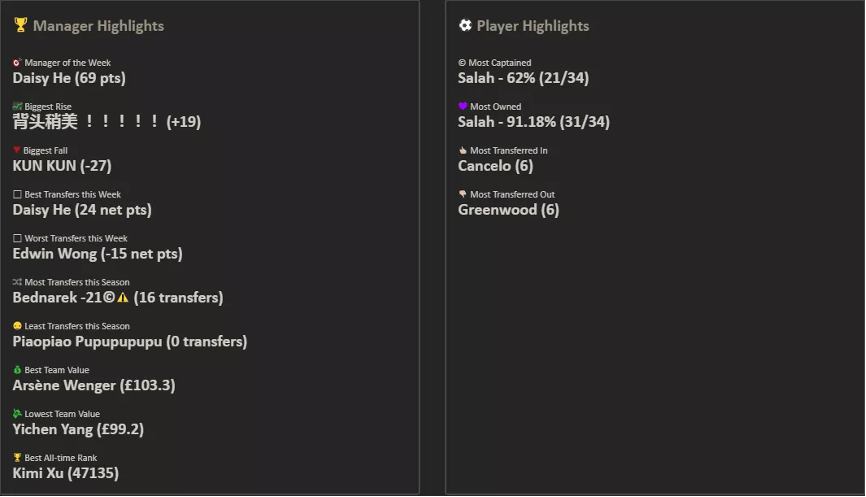 9.本轮的最佳转会操作来自饭怕稀,这位经理用本轮唯一的换人名额出掉了1分的Bruno,引进了24分的Salah并给予队长,这波操作可以说是直接翻身,虽然操作很简单,但及时引进Salah对整个球队来说还是至关重要的。10.本轮进步最大的经理是温格,炒股之王本轮爆发出惊人的能量砍下橘联杯最高分127分,直接一飞冲天从之前的48名来到了第11名的位置,恭喜他;而本轮退步最大的经理是熬到了开卡这一天 心情都好了,这位经理本轮发挥失常,由于选错了队长仅得58分,从积分榜第28名的位置掉到了第61名,希望她能够重整旗鼓早日反弹。