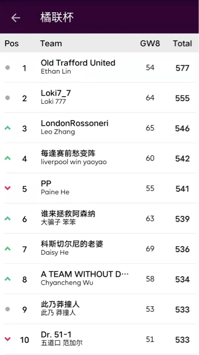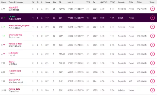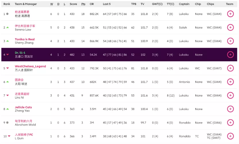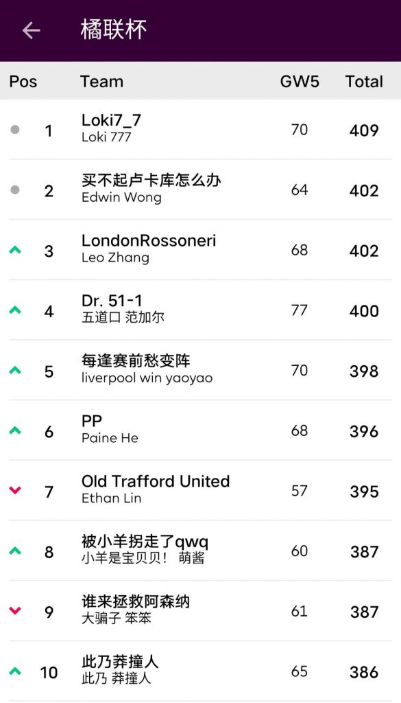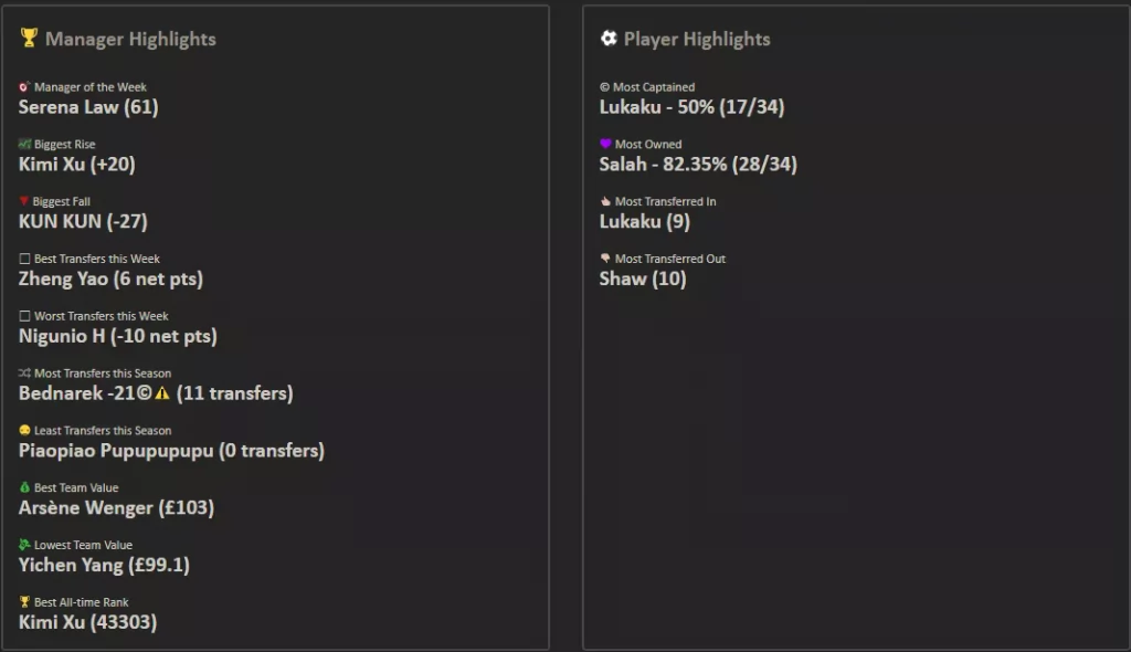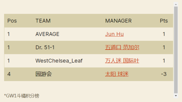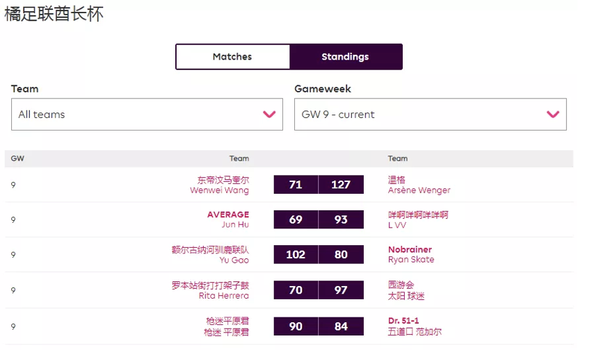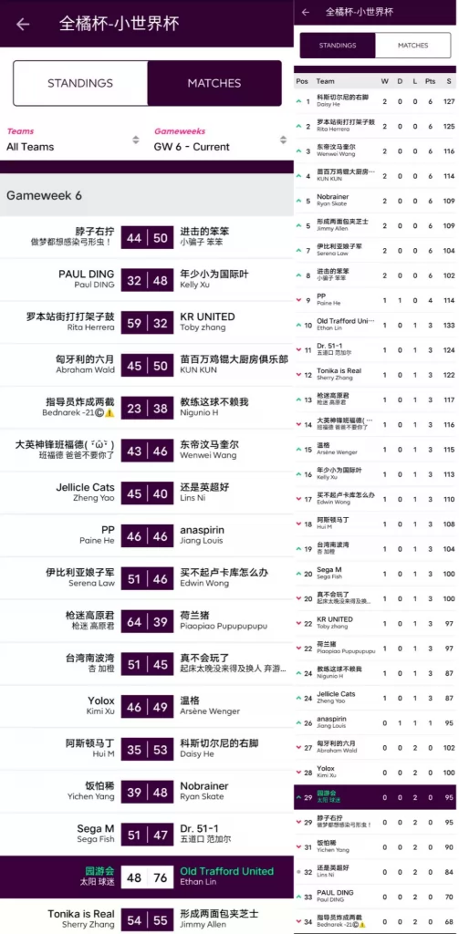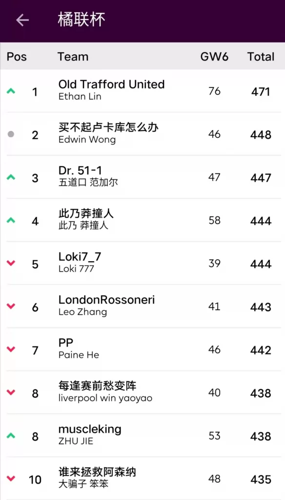9.本轮的最佳转会操作来自饭怕稀,这位经理用本轮唯一的换人名额出掉了1分的Bruno,引进了24分的Salah并给予队长,这波操作可以说是直接翻身,虽然操作很简单,但及时引进Salah对整个球队来说还是至关重要的。10.本轮进步最大的经理是温格,炒股之王本轮爆发出惊人的能量砍下橘联杯最高分127分,直接一飞冲天从之前的48名来到了第11名的位置,恭喜他;而本轮退步最大的经理是熬到了开卡这一天 心情都好了,这位经理本轮发挥失常,由于选错了队长仅得58分,从积分榜第28名的位置掉到了第61名,希望她能够重整旗鼓早日反弹。