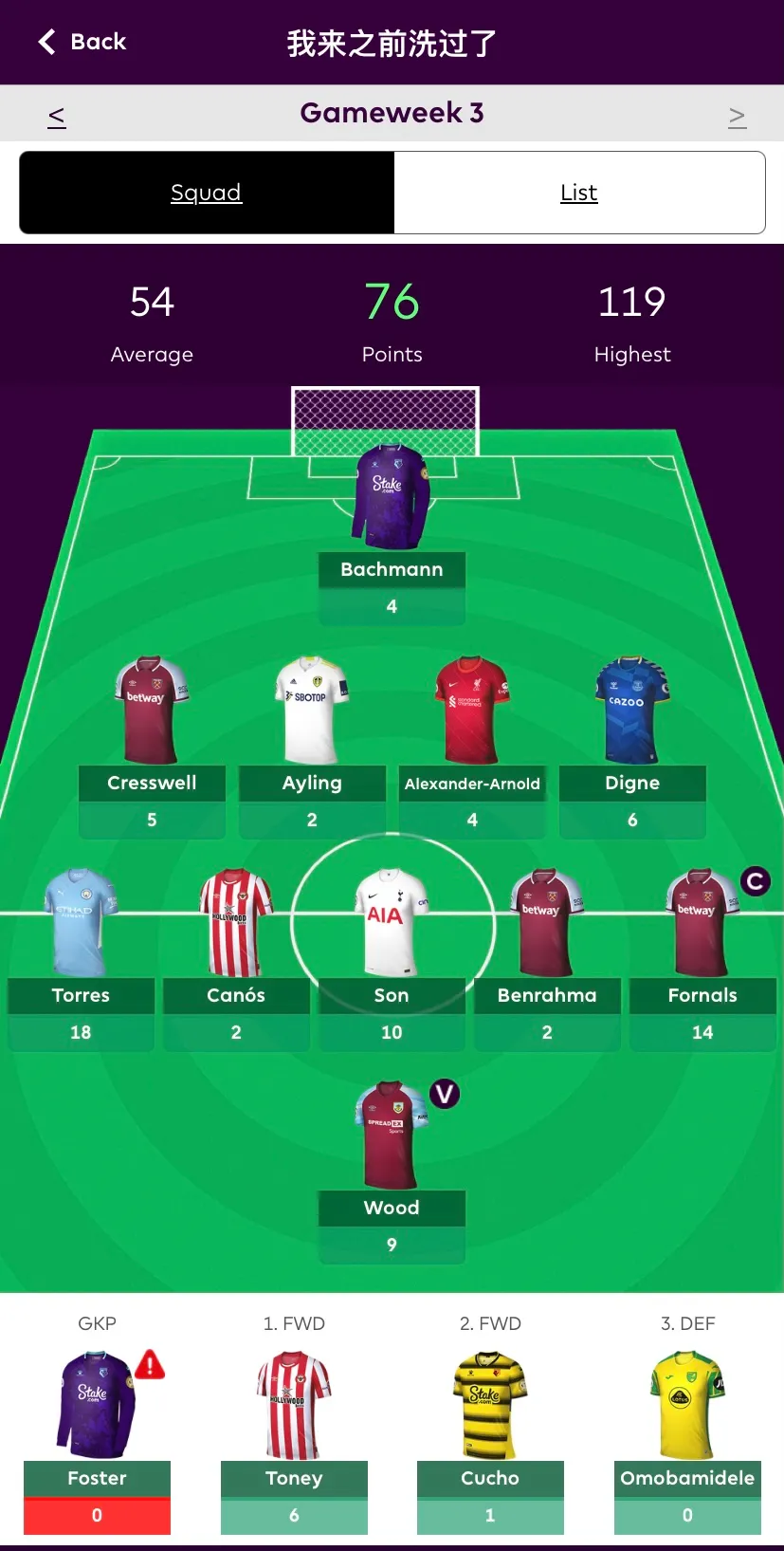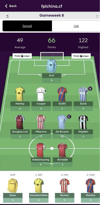 8.本轮的替补席最高分来自Sydney Central Park,这位经理的替补席包括13分的Smith Rowe、9分的Livramento、8分的Huang以及1分的Foster,替补席四名球员总共拿到了31分。而这位经理的首发也有93分,可以说实力是非常强劲了。