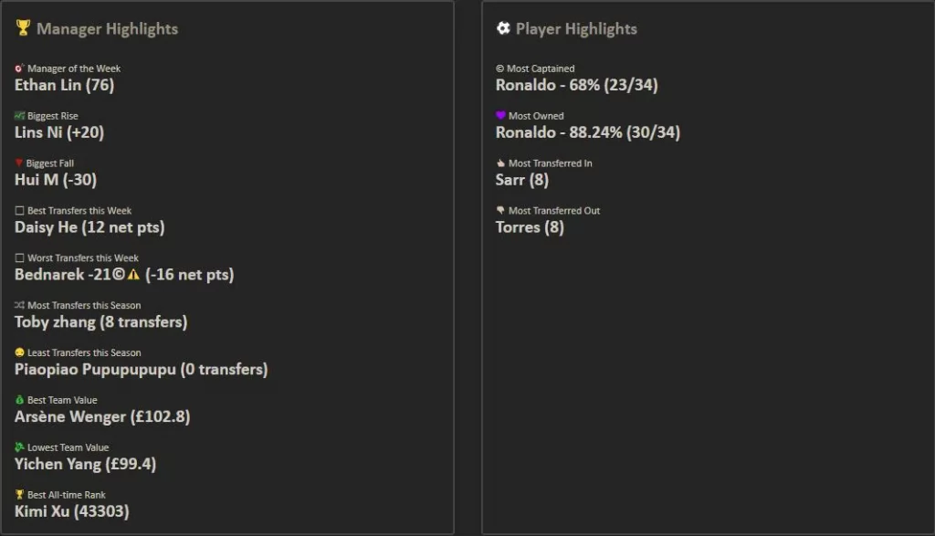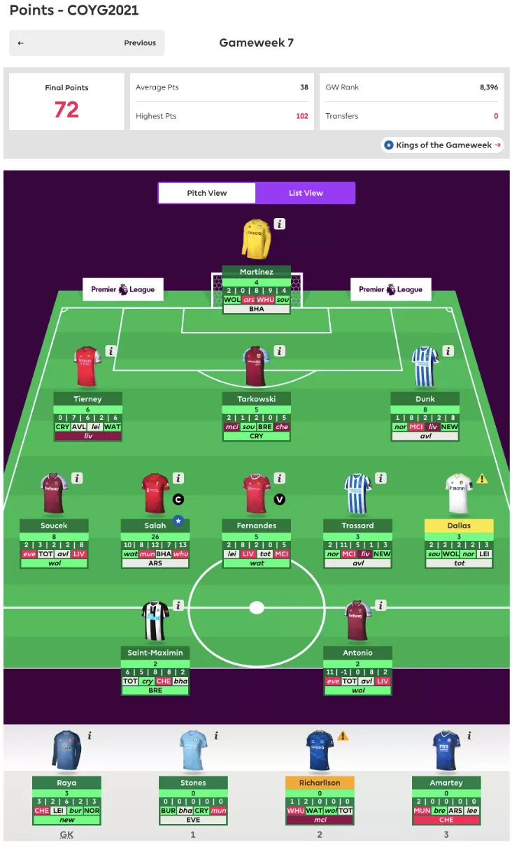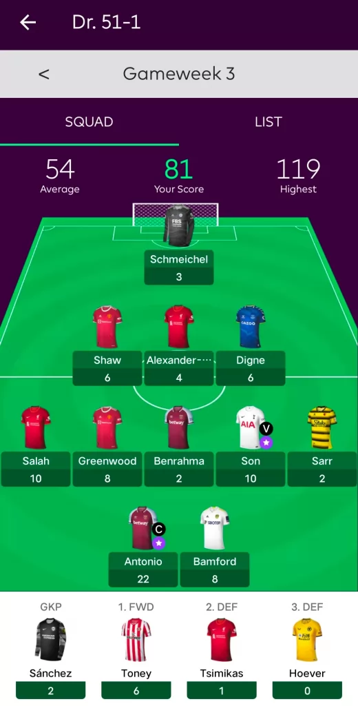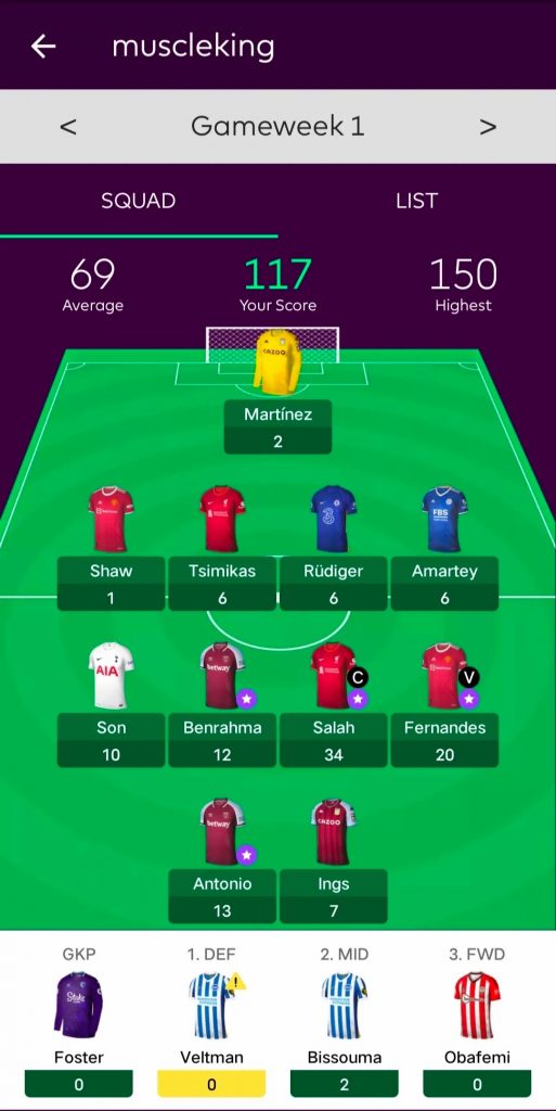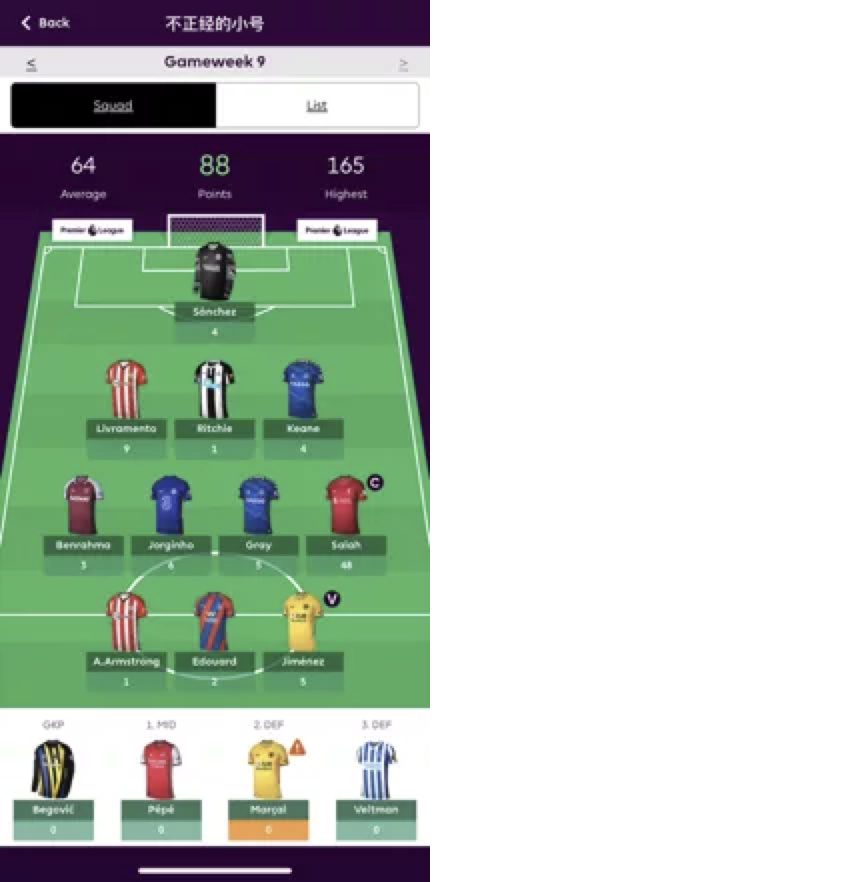 曾经帮助形成两面包夹芝士拿下无数硬仗的Smith Rowe本轮再立奇功,13分的出色表现弥补了全队仅有10人应战的局面,加之Salah和TAA的出色表现,全队交出了89分的不俗答卷,客队aspirin就不太走运了,队内伤兵满营同样仅有10人出战,而且被迫排出441阵型,单前锋CR的糟糕发挥也让其最终锁定在了76分输掉了比赛。
