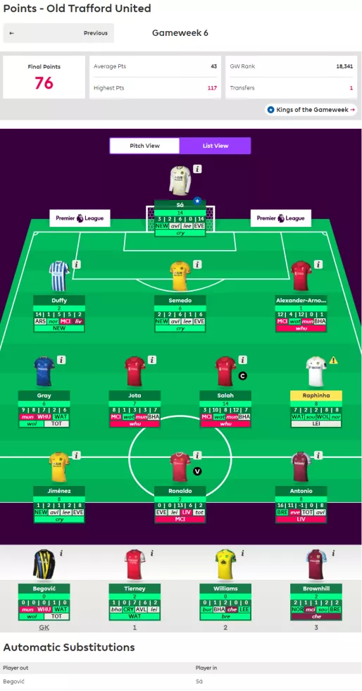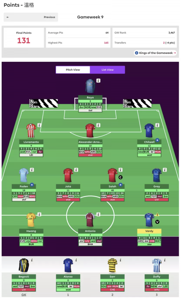 本赛季此前发挥失常的咩啊咩啊咩咩啊本轮迎来爆发,对主队阿森纳的信任收到了回报,队内三名阿森纳球员有两名完成了上分,加之Salah坐镇,全队砍下93分的高分,而客队肉老师C了一手Chilwell一度让人惊呼前国一回来了,但好景不长,Salah的神勇表现以及曼联的糟糕表现让肉老师最终失算。
