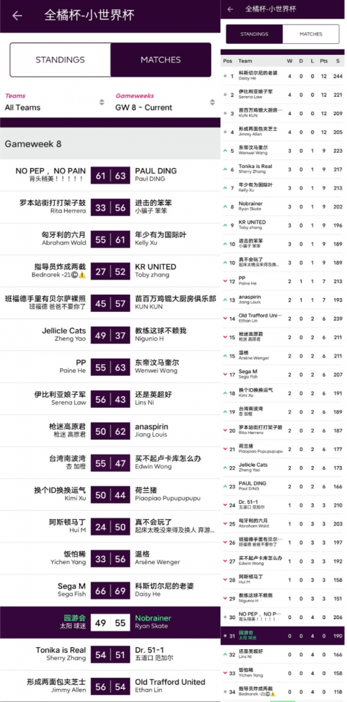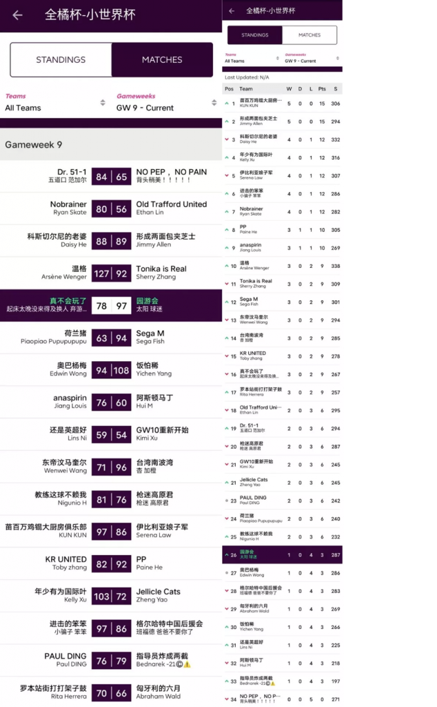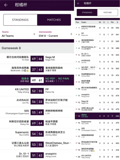 本轮收官战,两支最早备战GW9的球队狭路相逢,主队指导员虽然依靠利物浦上了大分,但由于转会操作失败,导致球队缺乏弹性仅得79分,而客队园游会依靠近两轮的慧眼识珠,成功选中了上分的Foden和Chilwell,最终拿到柑橘杯第二高分并终结了连败。