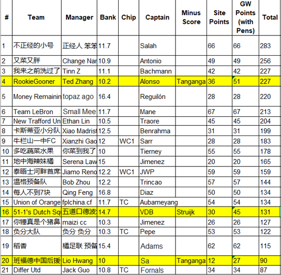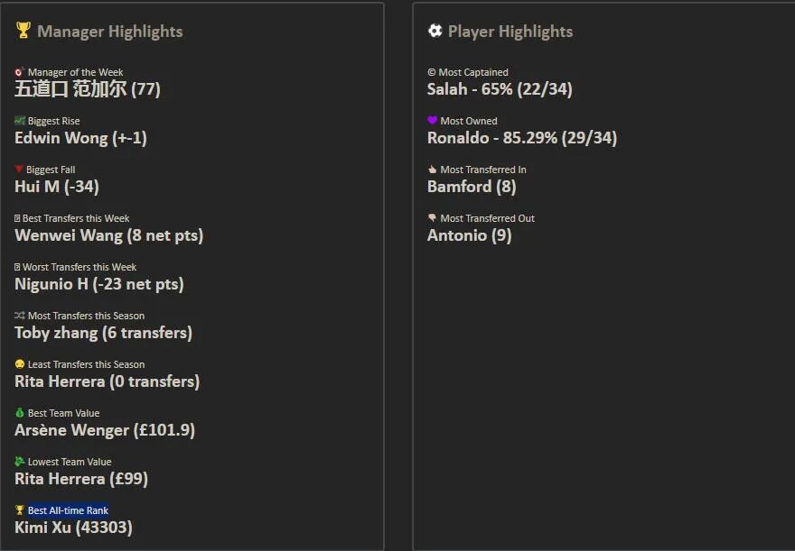 9.本轮的最佳转会操作来自饭怕稀,这位经理用本轮唯一的换人名额出掉了1分的Bruno,引进了24分的Salah并给予队长,这波操作可以说是直接翻身,虽然操作很简单,但及时引进Salah对整个球队来说还是至关重要的。10.本轮进步最大的经理是温格,炒股之王本轮爆发出惊人的能量砍下橘联杯最高分127分,直接一飞冲天从之前的48名来到了第11名的位置,恭喜他;而本轮退步最大的经理是熬到了开卡这一天 心情都好了,这位经理本轮发挥失常,由于选错了队长仅得58分,从积分榜第28名的位置掉到了第61名,希望她能够重整旗鼓早日反弹。