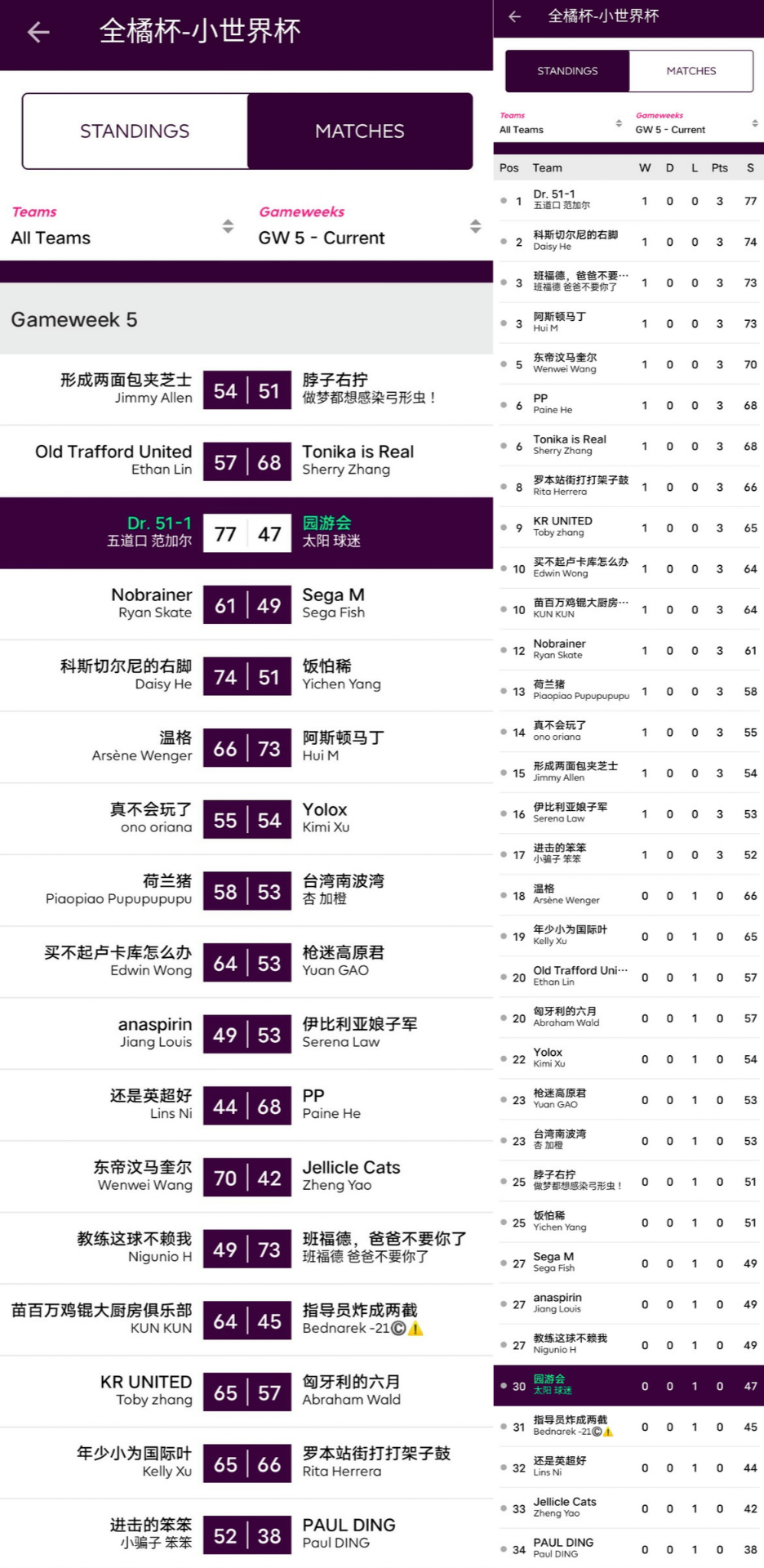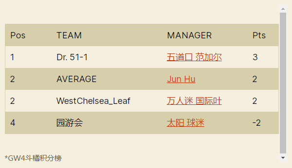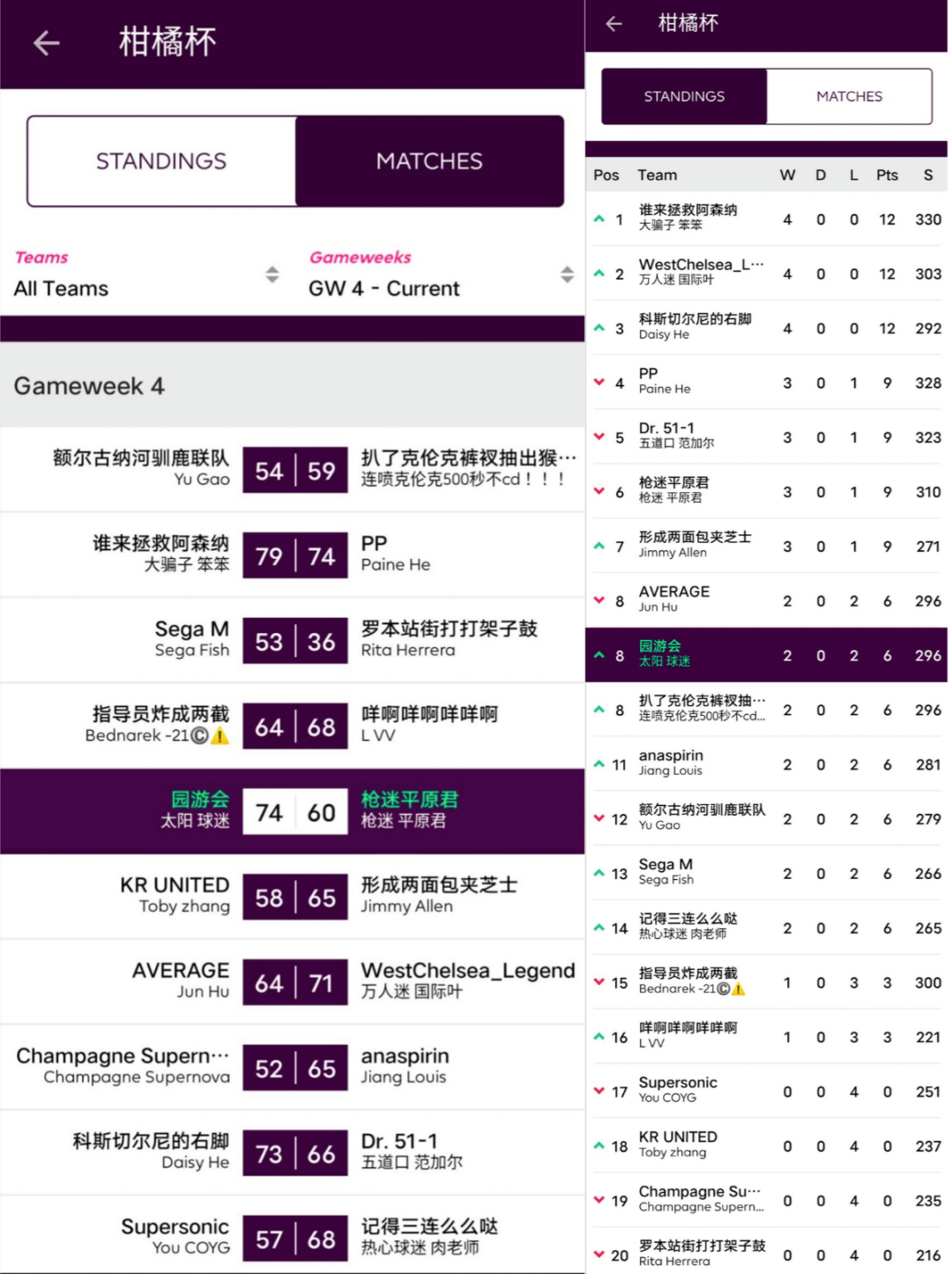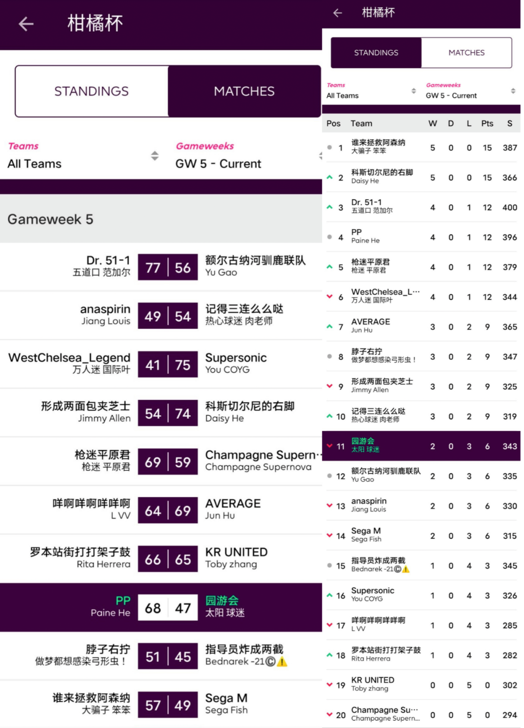 人间软柿子FC 74:97 园游会上轮被贬为“全橘杯最大鱼腩”的橘长园游会在本轮一雪前耻,用本联赛第一高分宣告了王者归来,面对副班长毫不留情取得了一场完胜;而对手Q姐本轮的表现其实并不差,坐拥了两位24分单轮最高分选手Salah+Mount,但错选队长还是遗憾败北。
