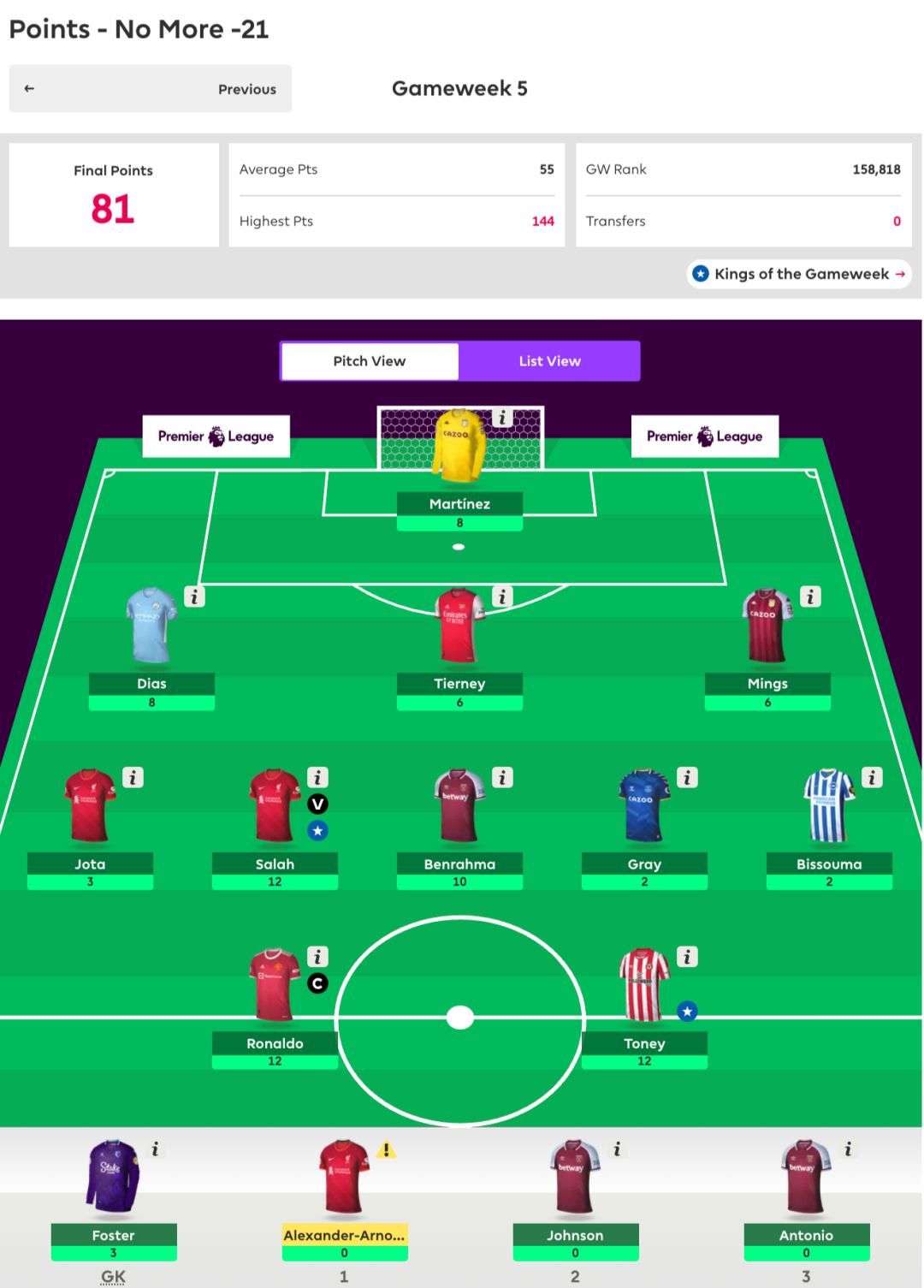 曾经帮助形成两面包夹芝士拿下无数硬仗的Smith Rowe本轮再立奇功,13分的出色表现弥补了全队仅有10人应战的局面,加之Salah和TAA的出色表现,全队交出了89分的不俗答卷,客队aspirin就不太走运了,队内伤兵满营同样仅有10人出战,而且被迫排出441阵型,单前锋CR的糟糕发挥也让其最终锁定在了76分输掉了比赛。