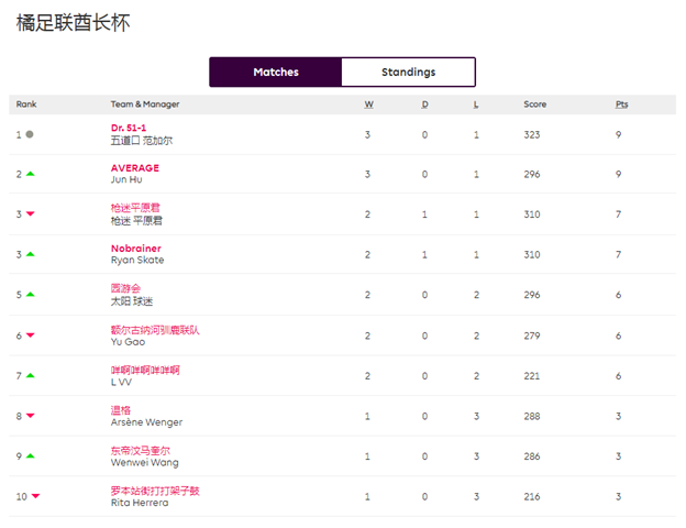 综述:积分榜前两名的Dr. 51-1和Jun本轮相继翻车,给了其他对手迎头赶上的机会,一鸣惊人的温格和成功雪恨的平原君已将差距缩小至2分;取得大捷的驯鹿联队和橘长园游会喜提绿箭头之后,占据第五、第六两个C位,东马则以1分之差退至第七;后三名的名次没有发生变化。九九归一,在酋长杯第二循环即将打响之际,各位经理又会如何调整,橘势又会发生什么变化呢?下轮状态炙手可热的温格和驯鹿联队将分别对阵惨遭滑铁卢的Jun和东马,不知是将“剩勇追穷寇”还是“沽名学霸王”?而橘长园游会在橘足联德比中,是将继续成为Dr. 51-1的ATM提款机还是将摇身一变成为POS机鲸吞对手?万圣节之际,Rita是否结束托管?一切精彩,无限悬念,尽在橘足联酋长杯。